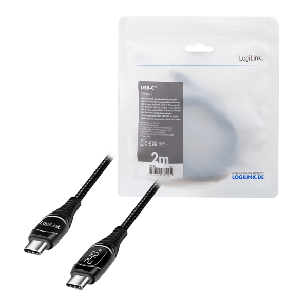 CABLU alimentare si date LOGILINK, pt. smartphone, USB 2.0, USB Type-C (T) la USB Type-C (T), 2m, PD 240W, OLED Display, conectori placati cu nichel, negru, "CU0185" (timbru verde 0.08 lei)