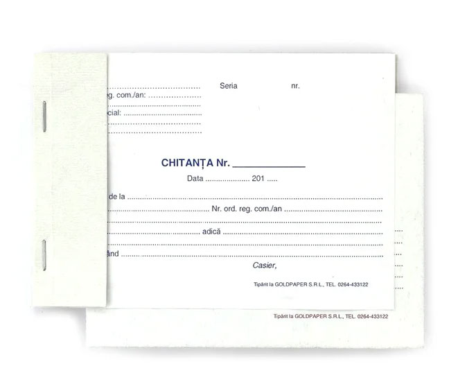 Chitanta autocopiativa este un formular tipizat, ce are formatul A6 cu orientare vedere. Blocul de chitante contine un numar de 100 file, impartite in 50 seturi a cate 2 exemplare, neinseriate. Formularul este tiparit doar fata, color (albastru si rosu/set), pe hartie autocopiativa de 55g/mp. Blocul de chitante are coperta din carton duplex alb, este capsat si are perforatii pentru o detasare mai usoara a fiecarui exemplar.