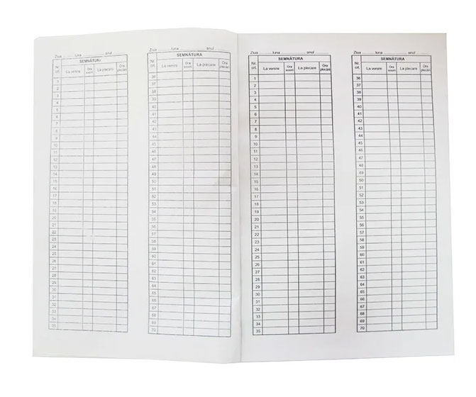 Condica de prezenta este un formular tipizat, ce are formatul A4 (205x297mm) cu orientare portret. Condica de prezenta contine un numar de 100 file. Formularul este tiparit fata-verso, alb-negru, pe hartie offset de 54g/mp. Condica de prezenta are coperta din hartie si este capsata.