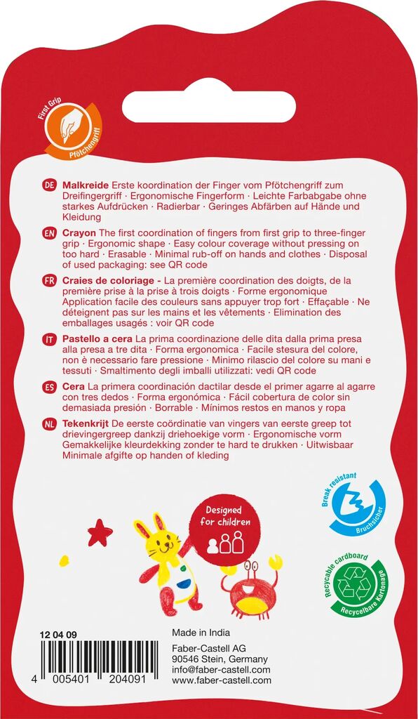 Creioane cerate model degete Faber-Castell – set de 6 bucati, ideale pentru cei mai mici artisti, fiind create special pentru a fi usor de tinut si folosit de catre copii. Culori intense si atractive. Design ergonomic, special adaptat pentru prinderea usoara cu degetele mici. Rezistente la rupere si nu murdaresc mainile. Culorile se aplica uniform si permit amestecarea usoara pentru efecte creative. Fabricate din materiale non-toxice, sigure pentru utilizarea de catre copii. Recomandate pentru dezvoltarea abilitatilor motorii si coordonarii ochi-mana.