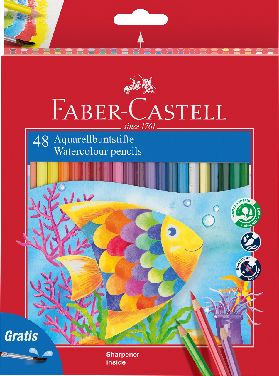 Cutie carton cu 48 creioane colorate acuarela + pensula + ascutitoare. Forma hexagonala. Culori stralucitoare, integral solubile in apa. Lipirea speciala (SV) previne ruperea minei. Se pot curata de pe majoritatea textilelor.