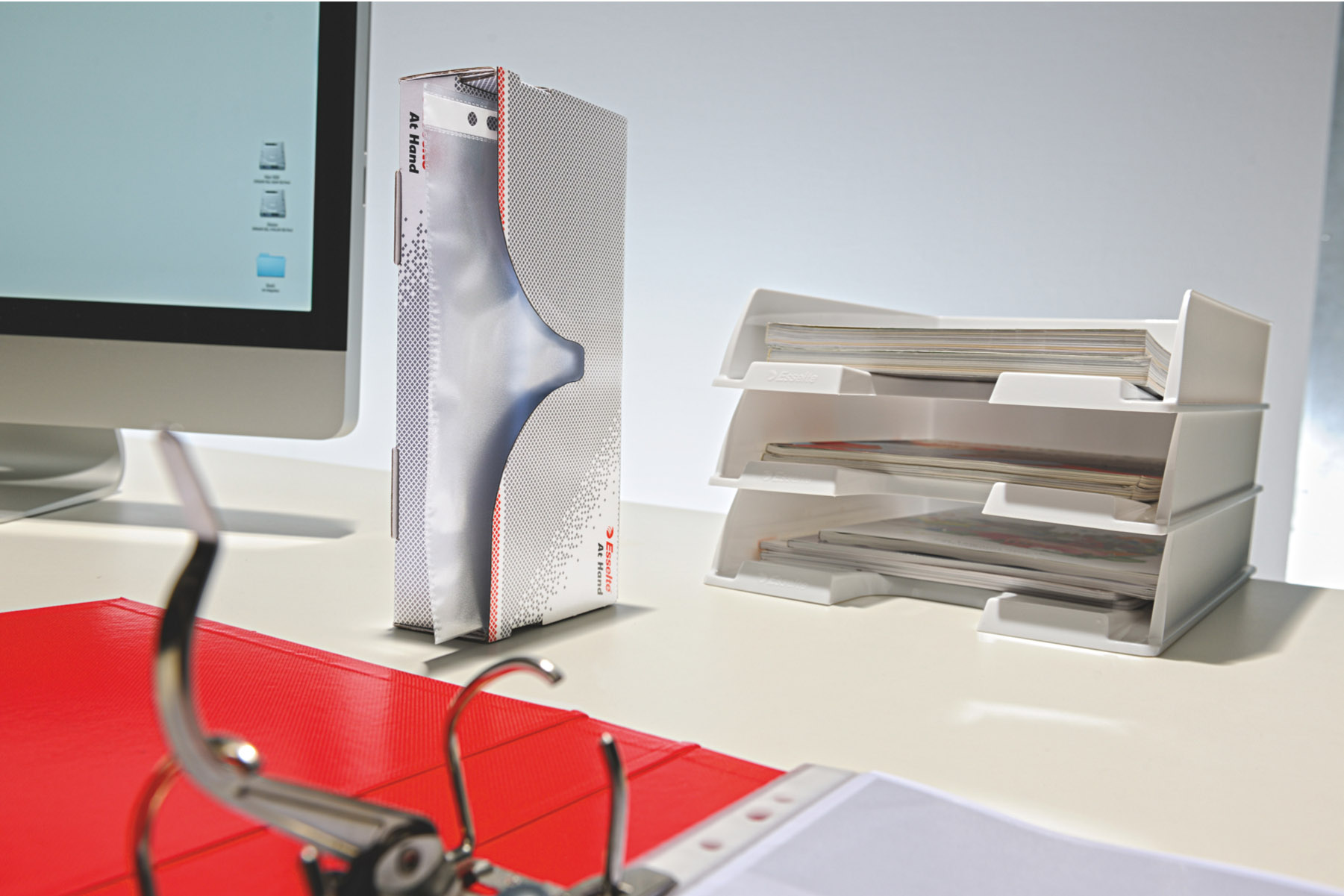 Sistemul este asemanator cutiilor de servetele si permite eliberarea foliilor una cate una. Dispenserul poate fi asezat oriunde, fara a ocupa mult spatiu: pe birou, intr-un sertar, deasupra imprimantei, etc. Cutia are un design atractiv in culori deschise, potrivit imaginii oricarui birou.