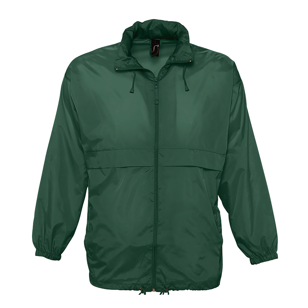 Jachetă de ploaie SURF cu fermoar și glugă integrată în guler, 100% rezistentă la apă și la vânt. Gluga are un cordon pentru ajustare, iar jacheta include două buzunare laterale cu fermoar.
