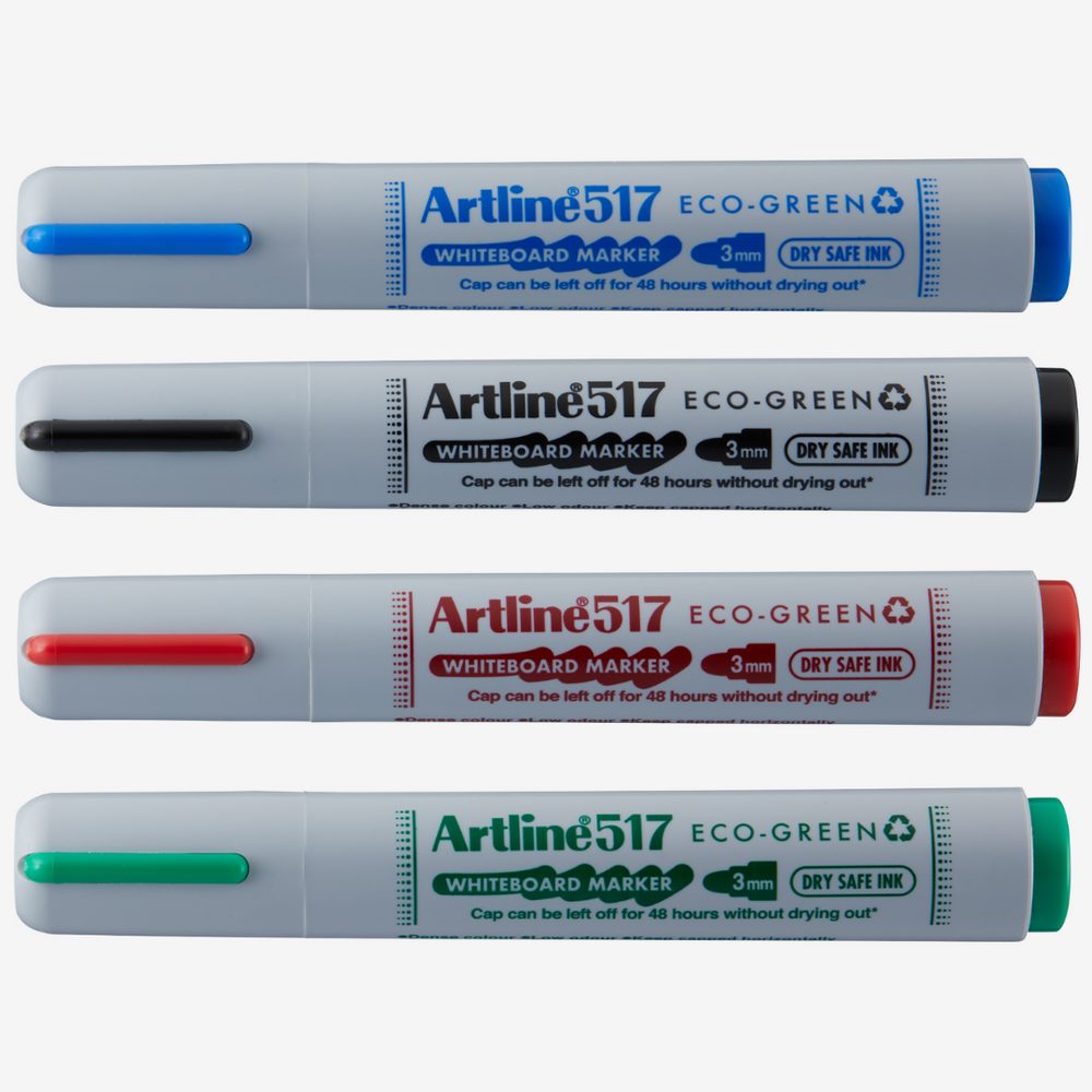 Marker pentru tabla de scris ARTLINE 517 Eco Green – Dry safe ink 48h, varf rotund 3.0mm, 4 cul/set