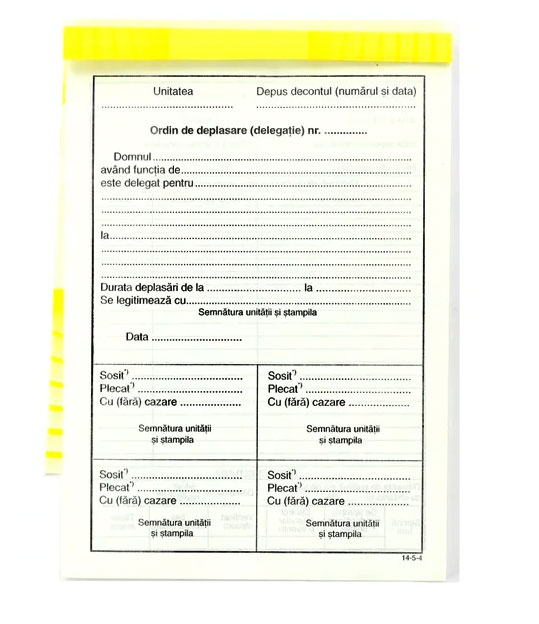 Ordinul de deplasare este un formular tipizat, ce are formatul A5 cu orientare portret. Blocul de ordine de deplasare contine un numar de 100 file, neinseriate. Formularul este tiparit fata-verso, alb-negru, pe hartie offset de 54g/mp. Blocul de ordine de deplasare are coperta color, este capsat si are perforatii pentru o detasare mai usoara a fiecarui exemplar.