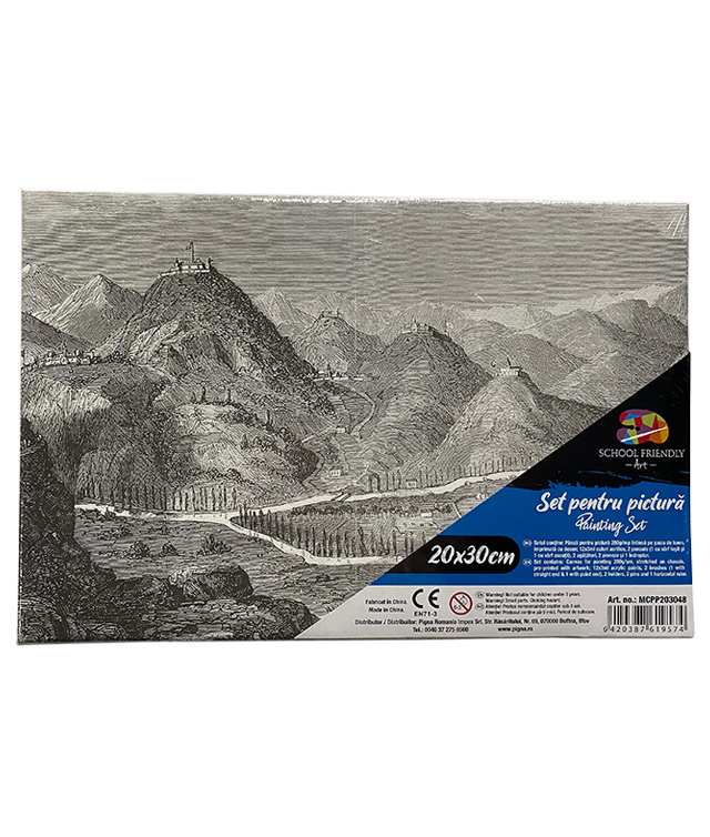 Panza pentru pictura intinsa pe sasiu din lemn, din bumbac de 280 g/mp, imprimata cu desen. Setul contine 12 culori acrilice de cate 3ml, 2 pensule (una cu varf tesit si una cu varf rotund), 2 agatatori, 2 pioneze, 1 indreptar si brosura cu sugestii de colorare.