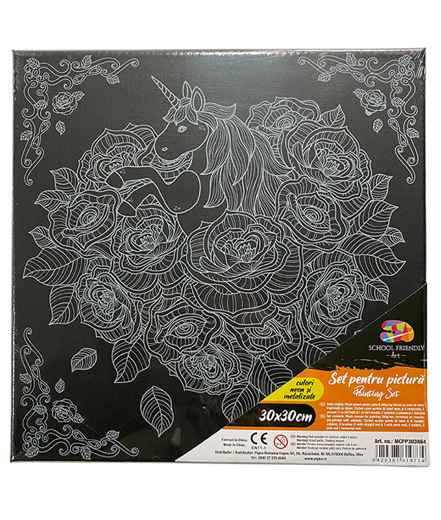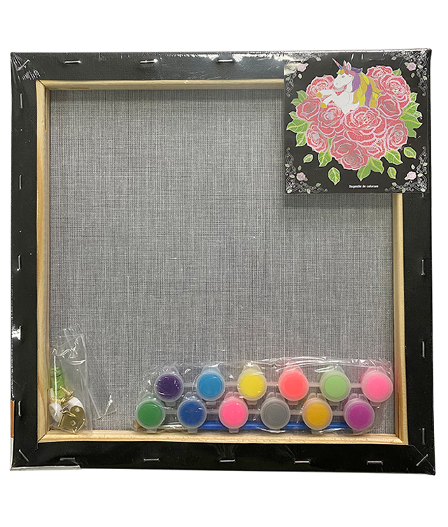 Panza pentru pictura intinsa pe sasiu din lemn, din bumbac de 280 g/mp, imprimata cu desen. Setul contine 12 culori acrilice de cate 3ml, 2 pensule (una cu varf tesit si una cu varf rotund), 2 agatatori, 2 pioneze, 1 indreptar si brosura cu sugestii de colorare.