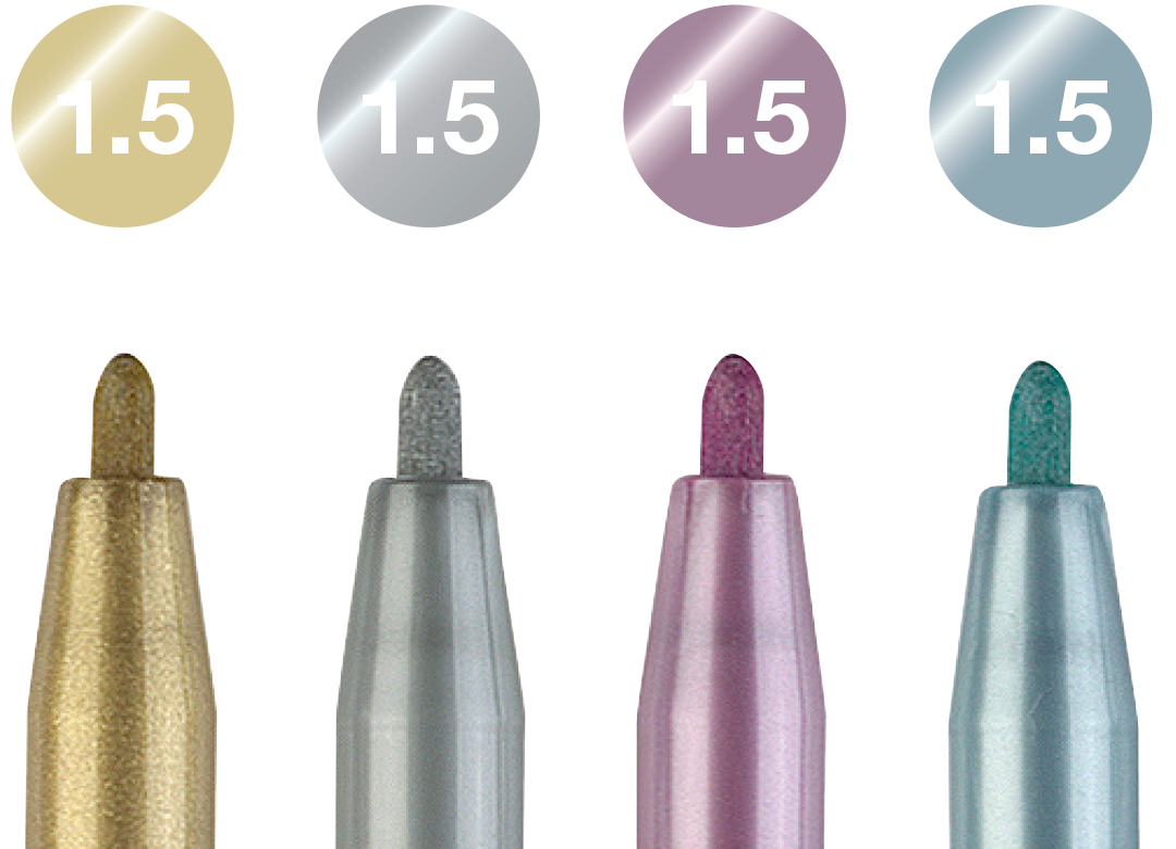 Set de 4 buc Pitt Artist Pen culori metalice cu linia de 1.5mm (auriu metalizat, argintiu metalizat, rubiniu metalizat, albastru matalizat). Cerneala cu PH neutru, rezistenta la lumina. Dupa uscare culorile sunt rezistente la apa si nu se intind pe hartie. Nu necesita amestec sau apasare. Opacitate inalta, chiar pe suprafete inchise.