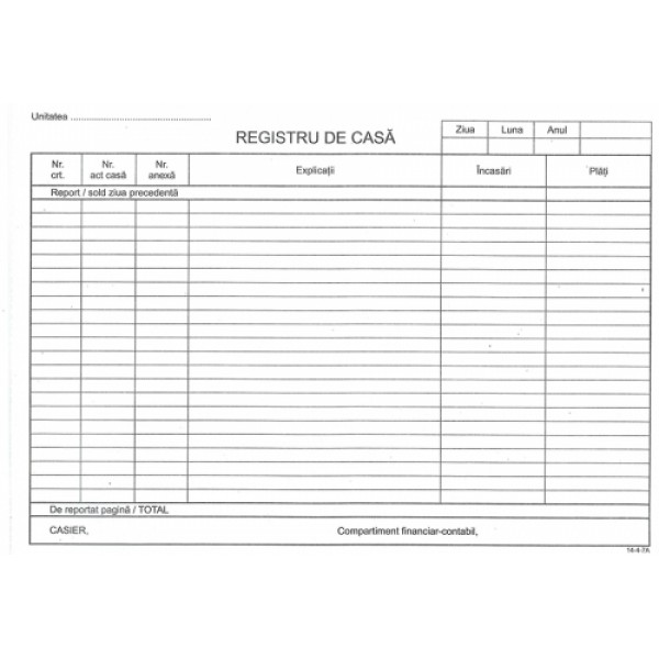Registrul de casa este un formular tipizat, ce are formatul A4 cu orientare vedere. Blocul de registre de casa contine un numar de 100 file, neinseriate. Formularul este tiparit doar fata, alb-negru, pe hartie offset de 54g/mp. Blocul de registre de casa are coperta color, este capsat si are perforatii pentru o detasare mai usoara a fiecarui exemplar.