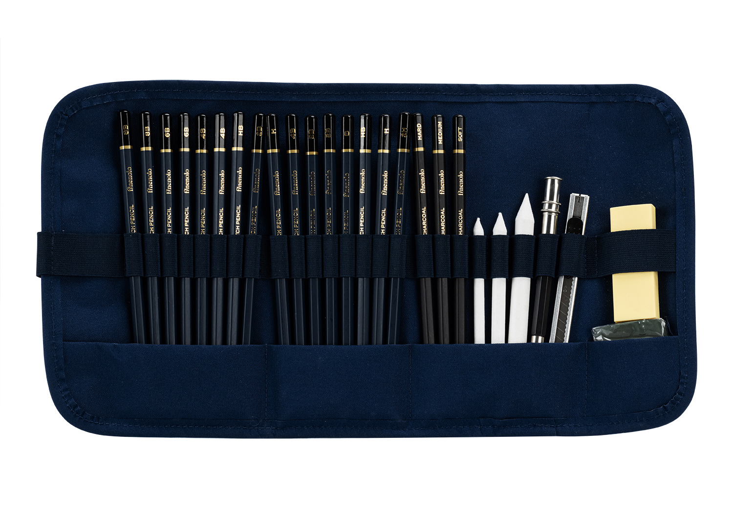 Rollup Deli ce contine 27 de piese utile oricarui artist. Setul complet de instrumente include o varietate de creioane grafit de inalta calitate si instrumente de amestecare nuante. 12 creioane grafit cu taria minei de HB, 2B, 4B, 6B, 8B, 10B, 12B, 2H, 4H, 6H, 8H, 10H pentru linii precise, umbrire subtila si contraste indraznete. Setul mai contine: radiere, un cutter pentru ascutire, bloc de smirghel pentru umbrire neteda si evidentiere.