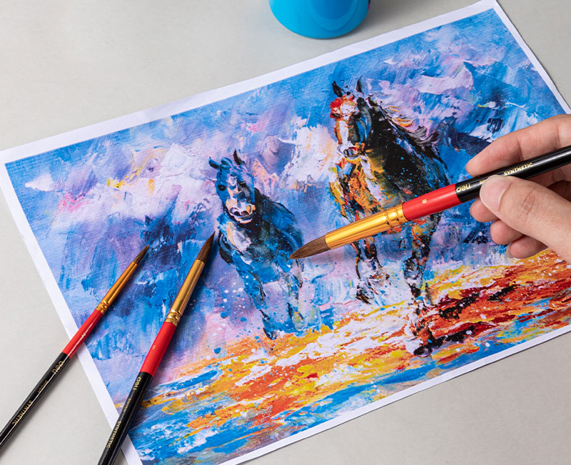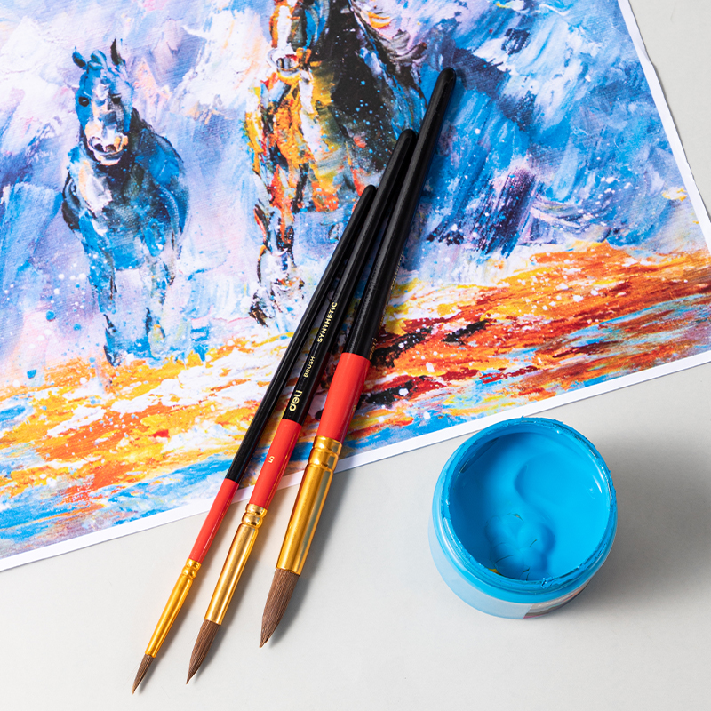 Set de 3 pensule Deli pentru pictura. Varf rotund de dimensiuni diferite. Potrivite pentru orice tip de vopsea, inclusiv acrilica, acuarela, ulei sau guasa. Peri din par natural de ponei. Corp din lemn, rezistent.