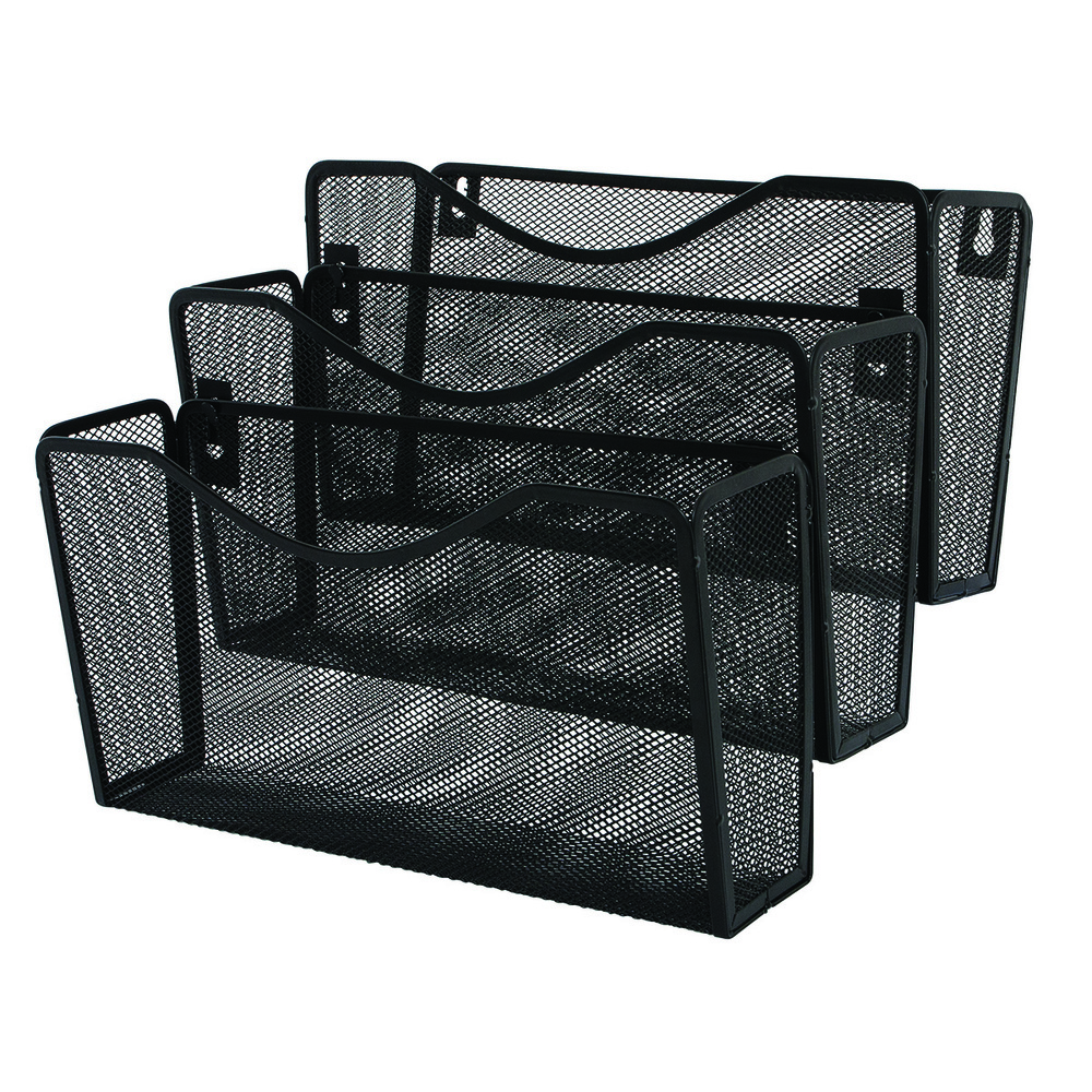 #Set suporti de perete, fabricat din mesh metalic, lacuit. #Se monteaza pe perete. #Se pot utiliza ca set sau separat. #Gauri pentru agatatoare. #Colturile exterioare faciliteaza introducerea si scoaterea documentelor. #Dimensiuni individuale: 325 x 88 x 170 mm. #Dimensiuni set: 325 x 239 x 330 mm. #Culoare: negru. #Ambalare: 3 buc/set.