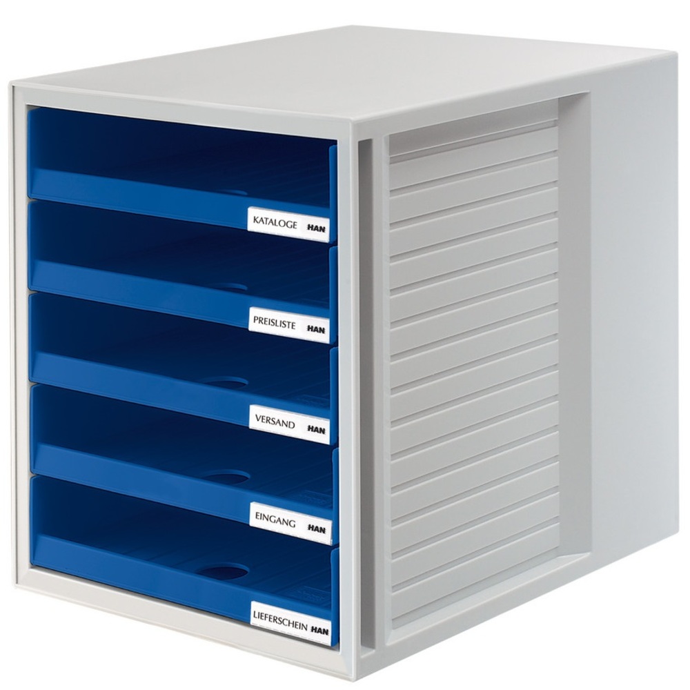Suport plastic cu 5 sertare pentru documente, HAN (open) – gri deschis – sertare albastre