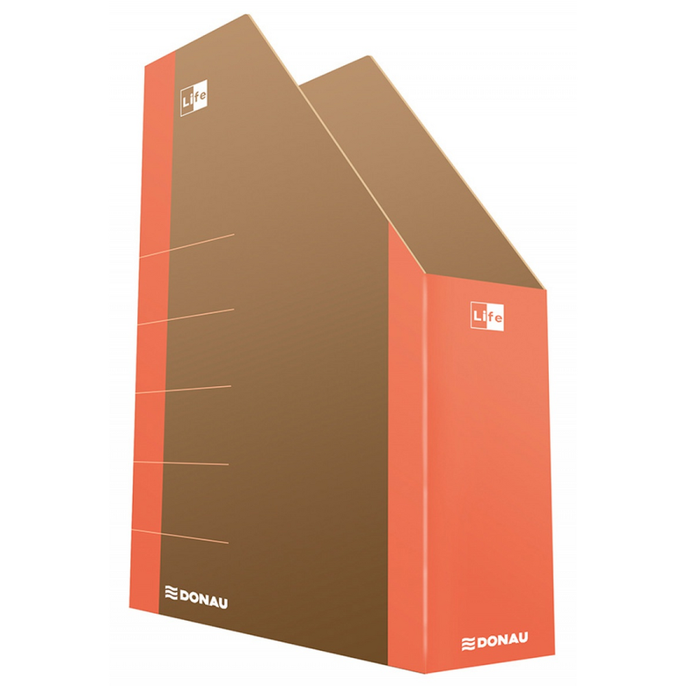 # Suport vertical pentru cataloage DONAU Life, margine portocalie, format A4, realizat din carton rezistent de 800 gsm. # Latime de 8 cm, ideal pentru organizarea revistelor, dosarelor sau documentelor. # Design functional si ecologic, perfect pentru birou sau acasa.