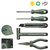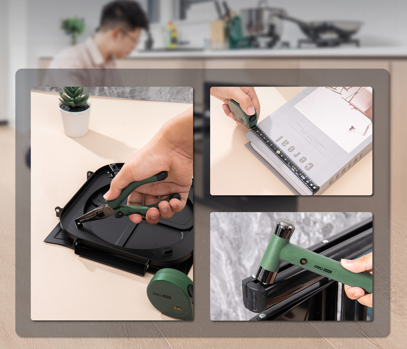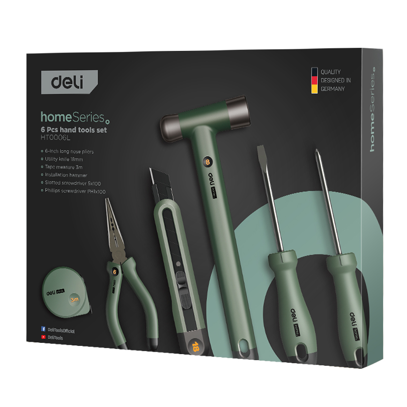 Trusa de scule verde Deli gama Home Series contine 6 piese de baza si anume: un cleste de 6 inch, o ruleta de 3 m, un ciocan, o surubelnita cu cap plat, o surubelnita Phillips in cruce si un cutter de 18 mm. Material din otel carbon. Maner cauciucat. Materiale de cea mai buna calitate, rezistente in timp, de folos in casa fiecaruia dintre noi.